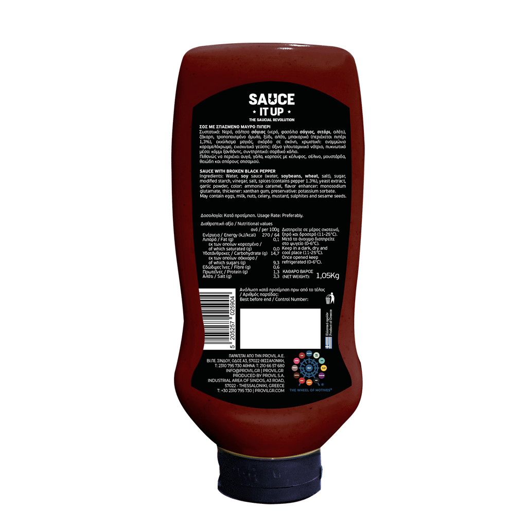 Νερό, σάλτσα ΣΟΓΙΑΣ (νερό, φασόλια ΣΟΓΙΑΣ, ΣΙΤΑΡΙ, αλάτι), ζάχαρη, τροποποιημένο άμυλο, ξύδι, αλάτι, μπαχαρικά (περιέχεται πιπέρι 1,3%), εκχύλισμα μαγιάς, σκόρδο σε σκόνη, χρωστική: εναμμώνιο καραμελόχρωμα, ενισχυτικό γεύσης: όξινο γλουταμινικό νάτριο, πυκνωτικό μέσο: κόμμι ξανθάνης, συντηρητικό: σορβικό κάλιο.