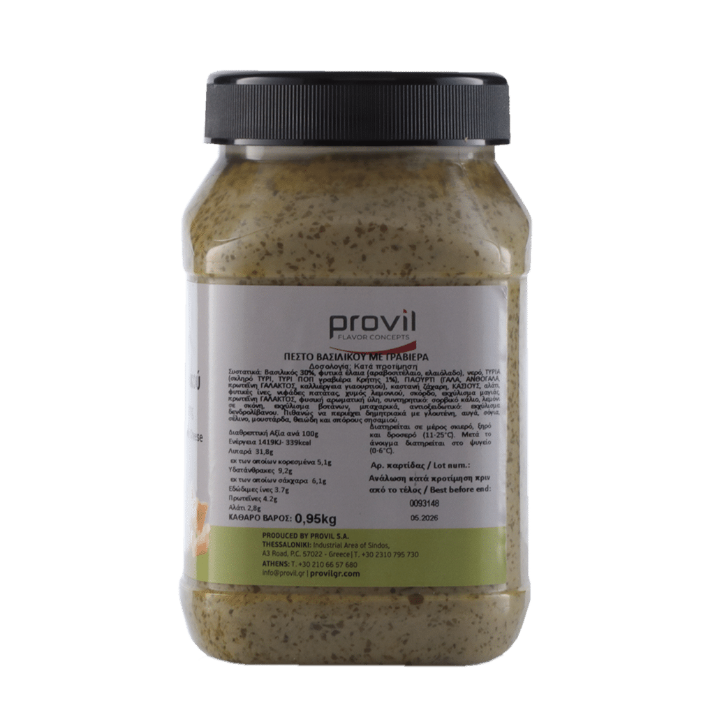 Βασιλικός 30%, φυτικά έλαια (αραβοσιτέλαιο, ελαιόλαδο), νερό, ΤΥΡΙΑ (σκληρό ΤΥΡΙ, ΤΥΡΙ ΠΟΠ γραβιέρα Κρήτης 1%), ΓΙΑΟΥΡΤΙ (ΓΑΛΑ, ΑΝΘΟΓΑΛΑ, πρωτεΐνη ΓΑΛΑΚΤΟΣ, καλλιέργεια γιαουρτιού), καστανή ζάχαρη, ΚΑΣΙΟΥΣ, αλάτι, φυτικές ίνες, νιφάδες πατάτας, χυμός λεμονιού, σκόρδο, εκχύλισμα μαγιάς, πρωτεΐνη ΓΑΛΑΚΤΟΣ, φυσική αρωματική ύλη, συντηρητικό: σορβικό κάλιο, λεμόνι σε σκόνη, εκχύλισμα βοτάνων, μπαχαρικά, αντιοξειδωτικό: εκχύλισμα δενδρολίβανου.