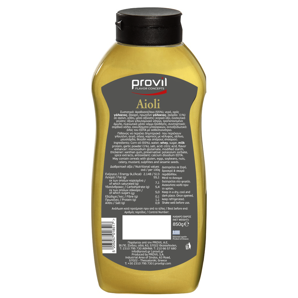 Αραβοσιτέλαιο, νερό, ορός ΓΑΛΑΚΤΟΣ, ζάχαρη, πρωτεΐνη ΓΑΛΑΚΤΟΣ, σκόρδο σε σκόνη, τροποποιημένο άμυλο, αλάτι, μέσο οξίνισης: κιτρικό οξύ, ενισχυτικό γεύσης: όξινο γλουταμινικό νάτριο, πυκνωτικό μέσο: κόμμι ξανθάνης, συντηρητικό: σορβικό κάλιο, εκχυλίσματα μπαχαρικών, αντιοξειδωτικό: άλας του EDTA με ασβεστιονάτριο.