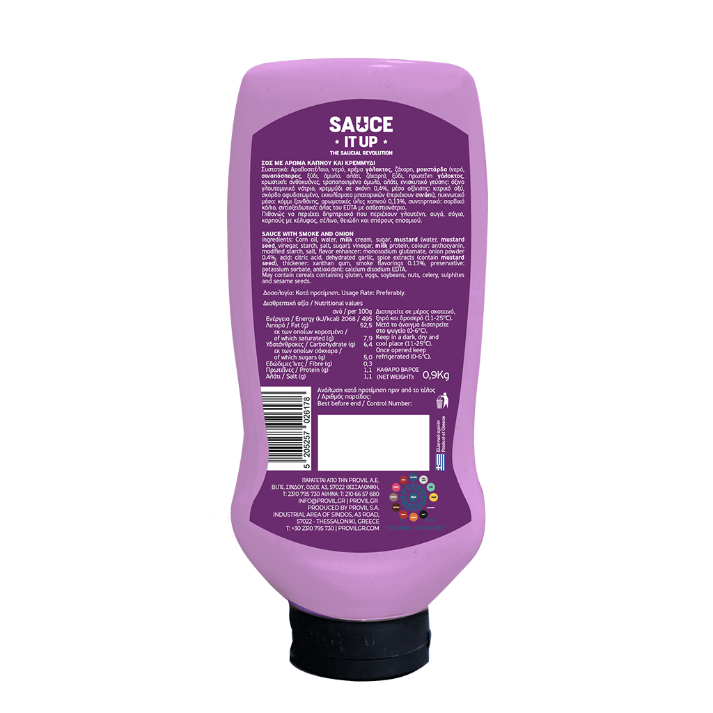 Αραβοσιτελαίο, νερό, κρέμα ΓΑΛΑΚΤΟΣ, ζάχαρη, ΜΟΥΣΤΑΡΔΑ (νερό, ΣΙΝΑΠΟΣΠΟΡΟΣ, ξύδι, άμυλο, αλάτι, ζάχαρη), ξύδι, τροποποιημένο άμυλο, πρωτεΐνη ΓΑΛΑΚΤΟΣ, αλάτι, χρωστική: ανθοκυάνες, ενισχυτικό γεύσης: όξινο γλουταμινικό νάτριο, κρεμμύδι σε σκόνη 0,4%, μέσο οξίνισης: κιτρικό οξύ, σκόρδο αφυδατωμένο, εκχυλίσματα μπαχαρικών (περιέχουν ΣΙΝΑΠΙ), πυκνωτικό μέσο: κόμμι ξανθάνης, αρωματικές ύλες καπνού 0,13%, συντηρητικό: σορβικό κάλιο, αντιοξειδωτικό: άλας του EDTA με ασβεστιονάτριο.
