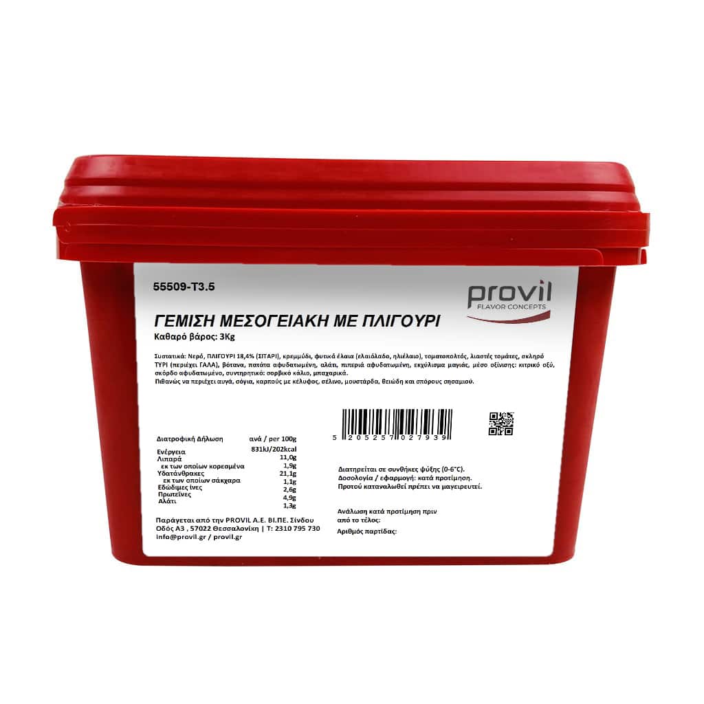Νερό, ΠΛΙΓΟΥΡΙ 18,4% (ΣΙΤΑΡΙ), κρεμμύδι, φυτικά έλαια (ελαιόλαδο, ηλιέλαιο), τοματοπολτός, λιαστές τομάτες, σκληρό ΤΥΡΙ (περιέχει ΓΑΛΑ), βότανα, πατάτα αφυδατωμένη, αλάτι, πιπεριά αφυδατωμένη, εκχύλισμα μαγιάς, μέσο οξίνισης: κιτρικό οξύ, σκόρδο αφυδατωμένο, συντηρητικό: σορβικό κάλιο, μπαχαρικά.